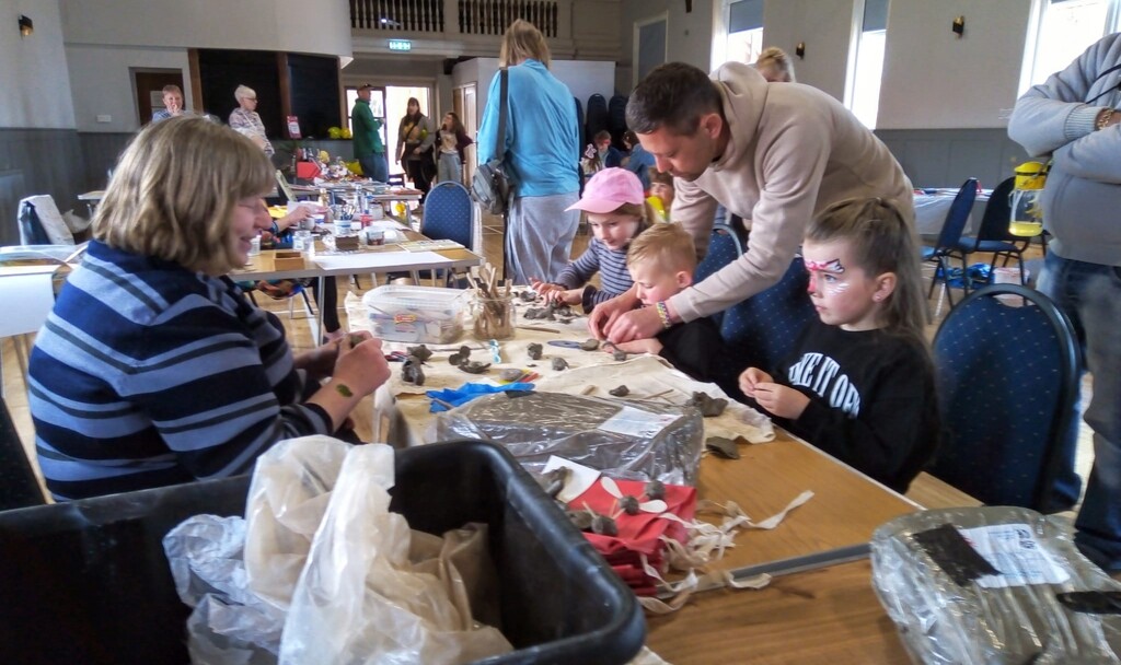 The Easter Extravaganza at Heacham Public Hall on 19th of April was a huge success. Much fun was had by all. Easter bonnets, clay animals, monoprints and seascapes were made. Plus people tried their hand at card making, quilling, scrap-booking, crocheting and pebble painting – Oh and lots of cakes and scones (thanks to Joanna at Modern Story) were consumed!